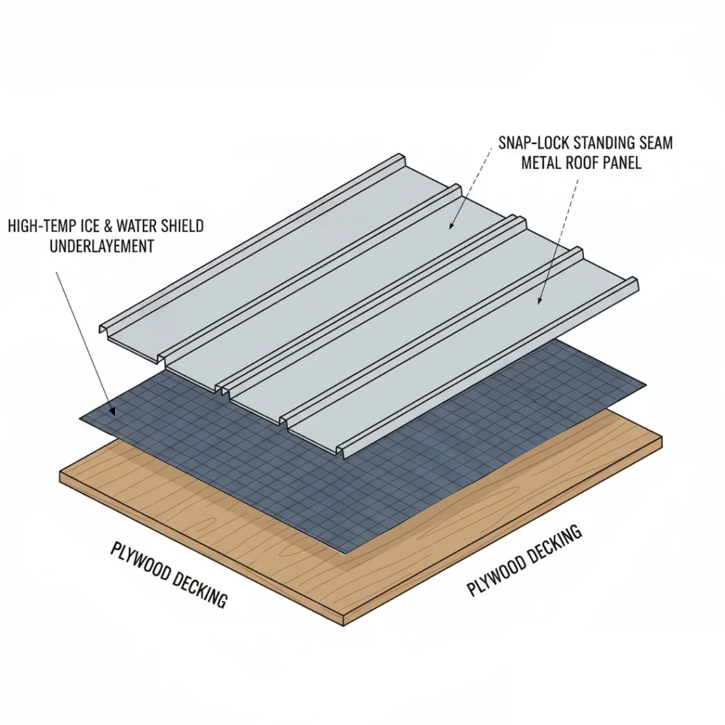 Interlocking seams shed ice and water, creating a monolithic barrier that